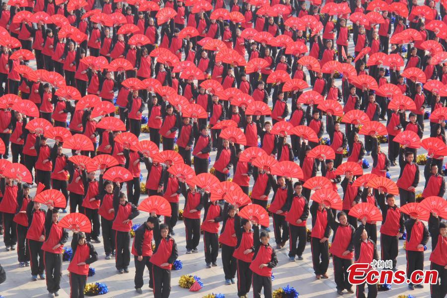 Chinese students do physical exercise together during the class break at a school in East China’s Jiangsu province, March 25, 2015. A total of 6,700 students participated in the group exercise that combines diverse body movements with or without props, forming a spectacular scene. (Photo: China News Service/Shao Shixin)