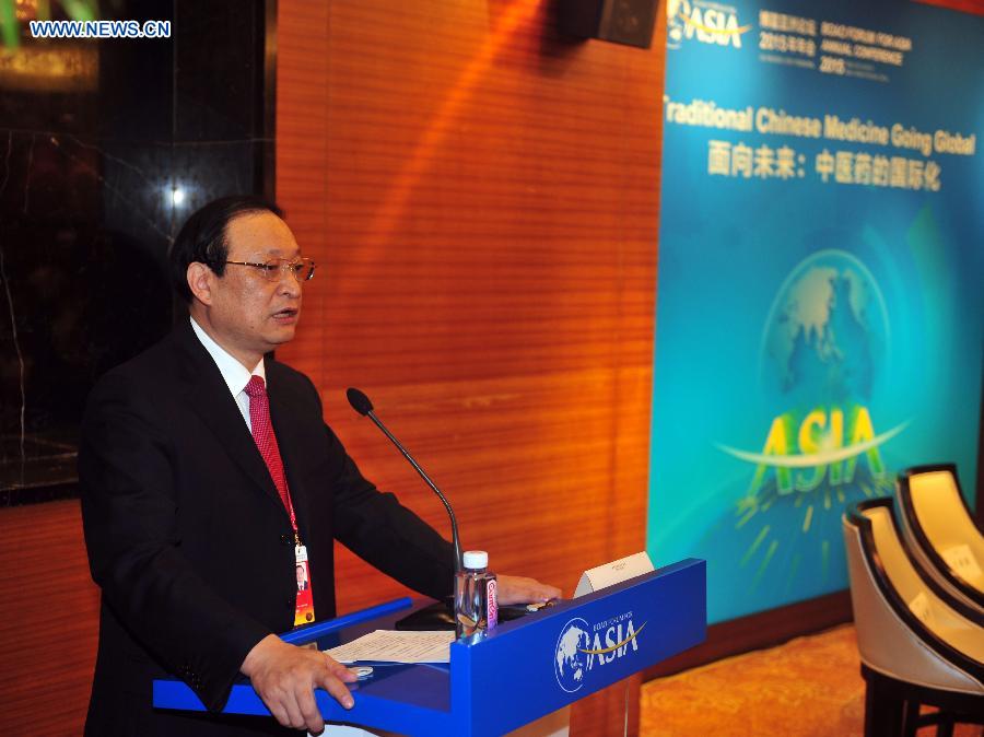 Wang Guoqiang, vice minister of the National Health and Family Planning Commission of China, speaks in the breakfast meeting with the theme of "Traditional Chinese Medicine Going Global" during the 2015 Boao Forum for Asia (BFA) in Boao, south China's Hainan Province, March 27, 2015. (Xinhua/Yang Guanyu)