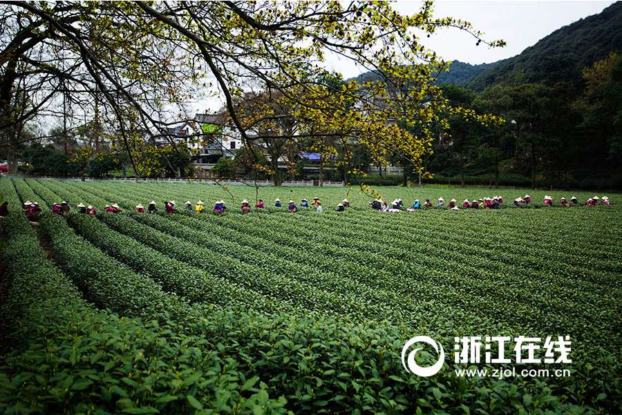 It is the annual season for tea-leaves picking in Meijiawu, Hangzhou. Looking down from above, the boundless green field, golden sunshine, and beautiful tea picking girls in colorful clothes composed an exquisite picture of the spring. (Zhejiang Online/Ni Yanqiang)