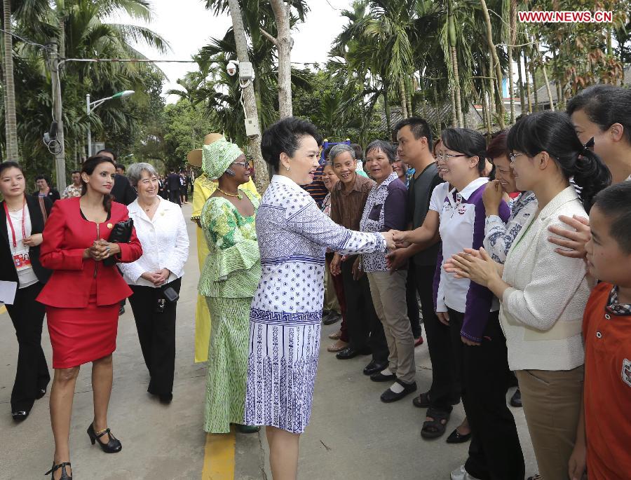 | Peng Liyuan (C), wife of Chinese President Xi Jinping, and guests greet the local residents in Beireng Village, south China's Hainan Province, March 28, 2015. Peng invited part of the wives of foreign leaders taking part in the 2015 Boao Forum for Asia (BFA) Annual Conference to visit Beireng Village on Saturday. (Xinhua/Lan Hongguang) |