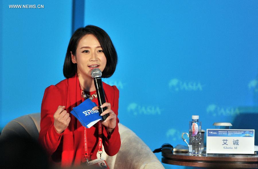 Gloria Ai, founder of iAsk Media, presides over a sub-forum with the theme of "Entrepreneurs: Born or Made?" at the 2015 Boao Forum for Asia (BFA) in Boao, south China's Hainan Province, March 28, 2015. (Xinhua/Yang Guanyu)
