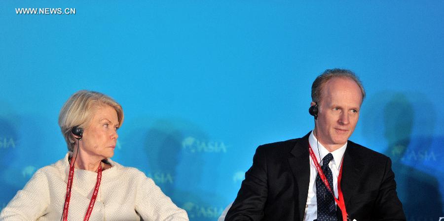 Gail D. Fosler (L), President of the GailFoster Group, and Mark Machin, President of Canada Pension Plan Investment Board Asia Inc., attend a sub-forum with the theme of "Shadow Banking: The Good and Bad" during the 2015 Boao Forum for Asia (BFA) in Boao, south China's Hainan Province, March 28, 2015. (Xinhua/Yang Guanyu)