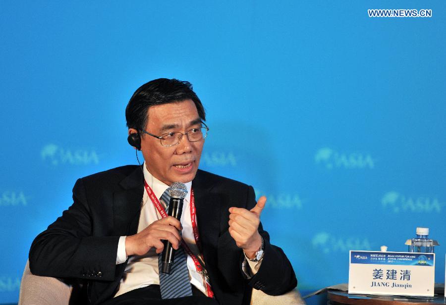 | Jiang Jianqing, chairman of Industrial and Commercial Bank of China, speaks at a sub-forum with the theme of "The Next Financial Crisis" during the 2015 Boao Forum for Asia (BFA) in Boao, south China's Hainan Province, March 28, 2015. (Xinhua/Yang Guanyu) |