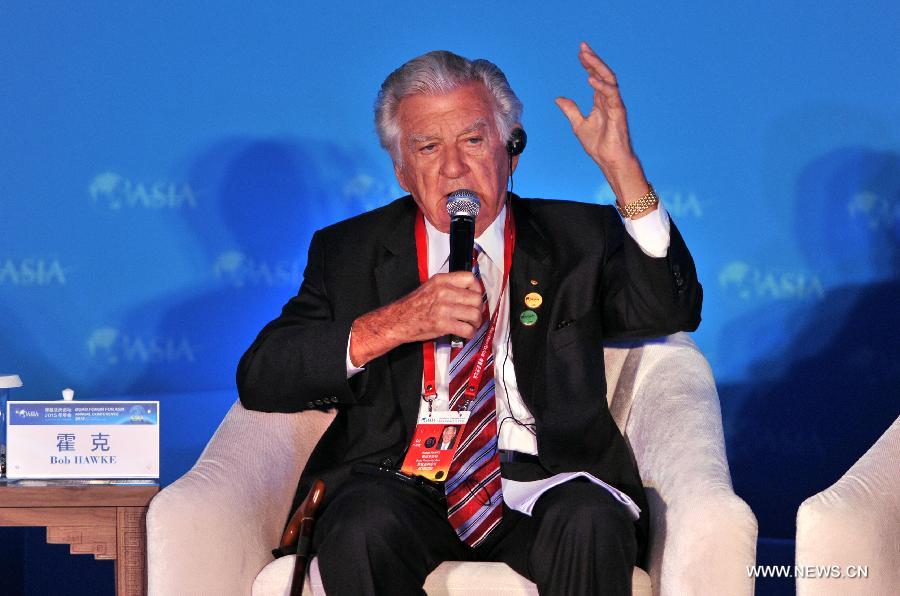 Former Australian Prime Minister Bob Hawke speaks at the sub-forum with the theme of "Transcending the Cold-War Mentality: A Fresh Outlook on Security Architecture in the Asia Pacific" during the 2015 Boao Forum for Asia (BFA) in Boao, south China's Hainan Province, March 29, 2015. (Xinhua/Yang Guanyu)