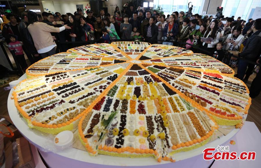 People gather around a giant fruitcake of 3.29 meters in diameter in Nanjing, capital of East China's Jiangsu province, March 28, 2015. The cake was made with 329 ingredients, including strawberry, mango, grape and ginseng fruit. Hundreds of citizens lined up to taste a slice of this giant cake. (Photo: China News Service/Yang Bo)