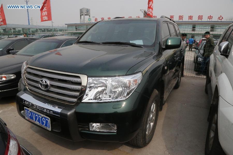 Photo taken on March 30, 2015 shows the top bid vehicle, a Toyota SUV, during an auction of the second batch of official vehicles in Beijing, capital of China. A total of 103 official vehicles were under the gavel at an auction house in Beijing on March 30. The official cars are among more than 3,000 taken out of service as part of reform measures that began last July to slash spending in this area. (Xinhua/Liu Xianguo)