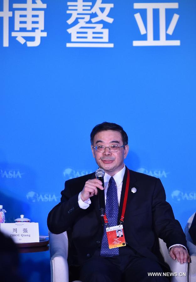 | Zhou Qiang, Chief Justice and President of the Supreme People's Court of China, speaks at a sub-forum with the theme of "BRICS Chief Justices' Dialogue: Pollution Control: the Power of Judiciary" during the 2015 Boao Forum for Asia (BFA) in Boao, south China's Hainan Province, March 29, 2015. (Xinhua/Zhao Yingquan) |