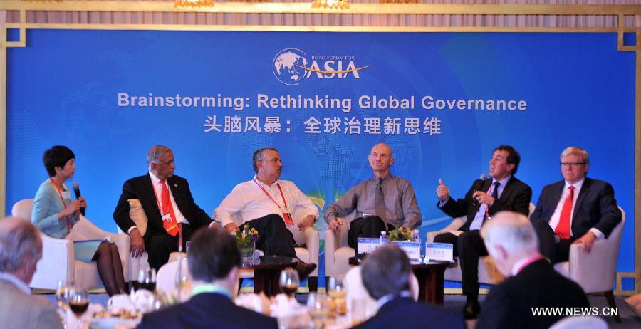 Guests attend the luncheon with the theme of "Brainstorming: Rethinking Global Governance" during the 2015 Boao Forum for Asia (BFA) in Boao, south China's Hainan Province, March 29, 2015. (Xinhua/Yang Guanyu)