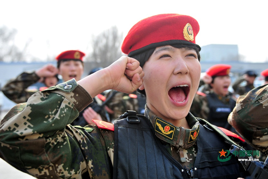 Team members of "Snow Eagle", a female detachment of Xinjiang Border Guard Corps, swear at the establishment ceremony on March 11, 2015. (Chinamil.com.cn/Fan Xinyu)