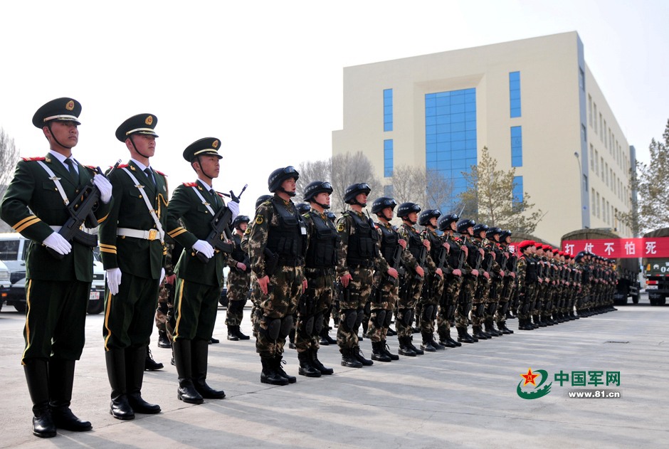 Team members of "Snow Eagle", a female detachment of Xinjiang Border Guard Corps, participate in the establishment ceremony on March 11, 2015. (Chinamil.com.cn/Fan Xinyu)