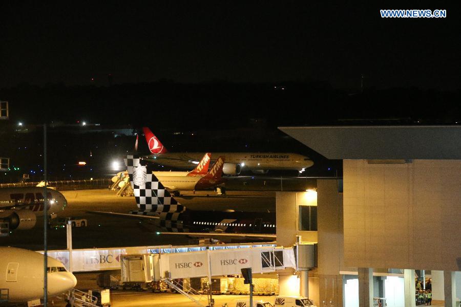A plane of the Turkish Airlines (back) is seen in the landing strip of the International Airport of Sao Paulo, Brazil, on March 30, 2015. According to local press, a Turkish airlines Boeing 777-300 ER plane from Istambul to Sao Paulo, which made on Monday an emergency landing in Casablanca international airport, was allowed to continue its flight to its destination.(Xinhua/Alex Silva/Estadao Conteudo/AGENCIA ESTADO)