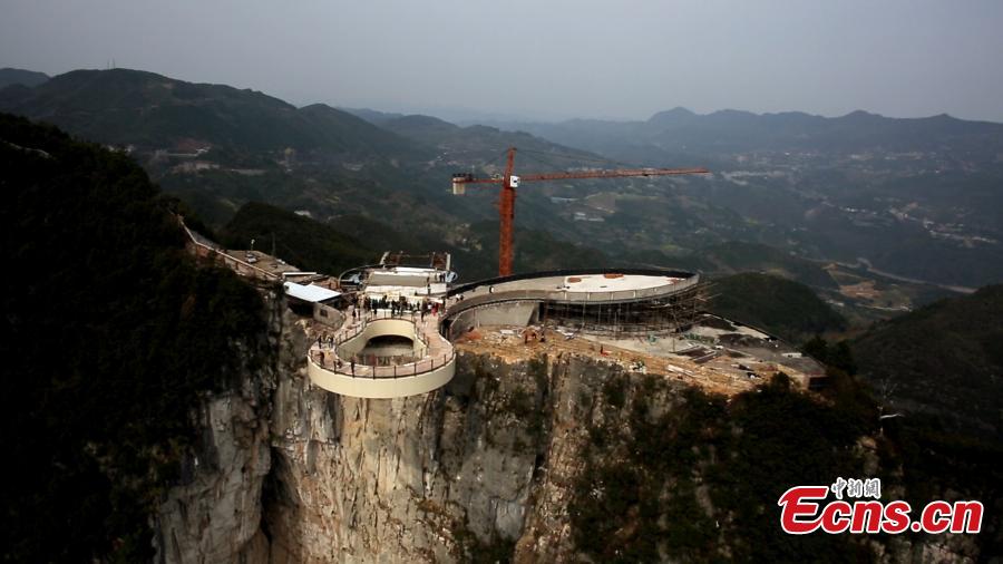 Workers are finishing the construction of a glass cantilever bridge in Longgang scenic area in Yunyang, Southwest China's Chongqing municipality. The transparent structure, 718 meters above the ground, has a cantilever extending 26.64 meters from the edge, five meters longer than the Grand Canyon Skywalk. The project, with a total investment of 35 million yuan($5.6 million), started in March 2014. The bridge has a carrying capacity of 1000 tons.(Photo: China News Service/Zhong Xin)