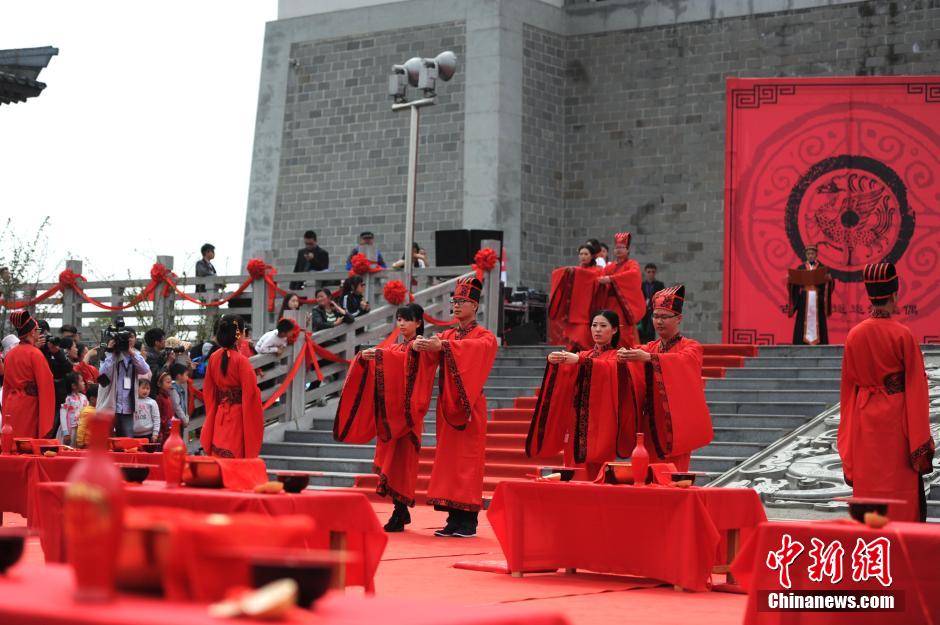 A group wedding ceremony is held in Hefei, Anhui province on March 29, 2015. 30 new couples in Han Chinese costumes perform a series of Han traditional wedding rituals. (CNS/Zhang Yayu)