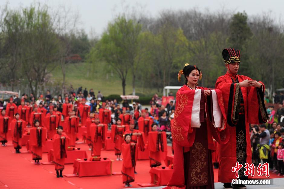 A group wedding ceremony is held in Hefei, Anhui province on March 29, 2015. 30 new couples in Han Chinese costumes perform a series of Han traditional wedding rituals. (CNS/Zhang Yayu)