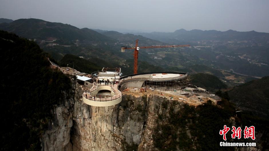 The world's longest glass cantilever bridge in Yunyang county, Chongqing, will be opened to tourists on May 1. The "Cloud bridge" is built on top of the cliffs 1,123 meters above sea level. The bridge is about 3.4 meters wide and 50 meters long, with a shape of flower. When one stands on it, he will feel totally "suspended" in the air without any line in sight. (Photo/CNS)