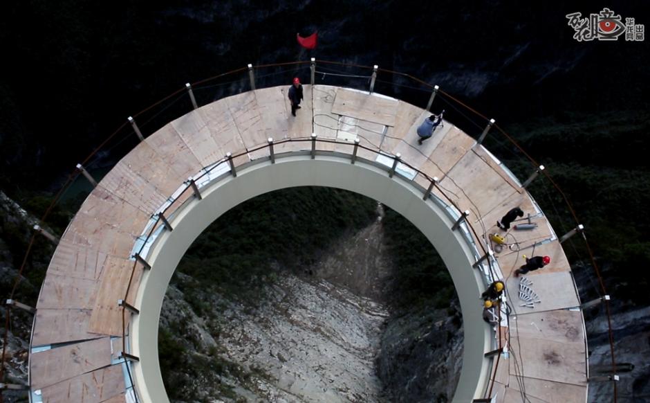The world's longest glass cantilever bridge in Yunyang county, Chongqing, will be opened to tourists on May 1. The "Cloud bridge" is built on top of the cliffs 1,123 meters above sea level. The bridge is about 3.4 meters wide and 50 meters long, with a shape of flower. When one stands on it, he will feel totally "suspended" in the air without any line in sight. (Photo/CNS)