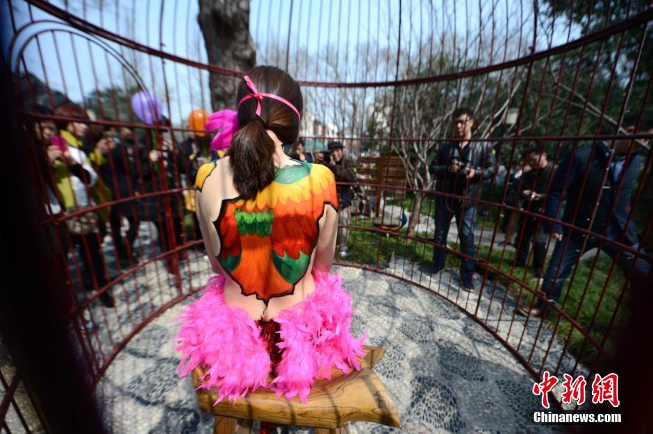 Lately a peacock themed body painting show was held in a giant birdcage in Yangzhou. Many citizens were attracted to the scene when artists painted on the bodies of the models. (Chinanews/Meng Delong)