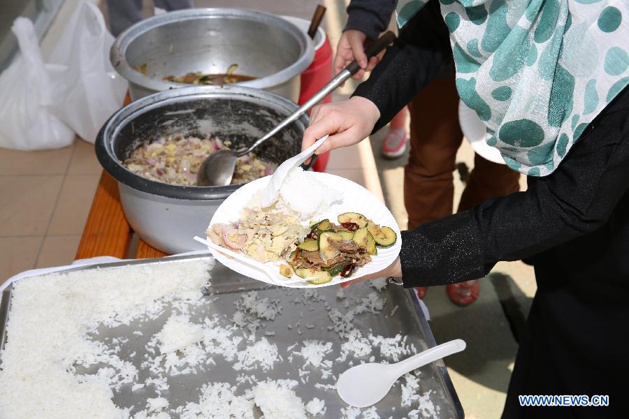 Special-served Muslim food are seen at the temporary rest center in Hassan Gouled in Djibouti, March 31, 2015. More than 500 Chinese evacuees from conflict-ridden Yemen have arrived at the Djibouti port as the situation continues to deteriorate in Yemen. (Xinhua/Pan Siwei)