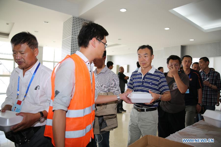 Chinese evacuees line up for lunch at the temporary rest center in Hassan Gouled in Djibouti, March 31, 2015. More than 500 Chinese evacuees from conflict-ridden Yemen have arrived at the Djibouti port as the situation continues to deteriorate in Yemen. (Xinhua/Pan Siwei)