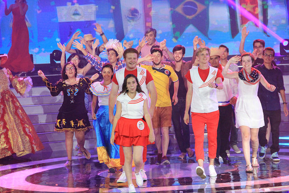 | Monica Cunha da Silva from Brazil, the winner of the 13th Chinese Bridge -- Chinese Proficiency Competition for Foreign College Students, performs on stage along with her fellow competitors. [Photo provided to China.org.cn] |