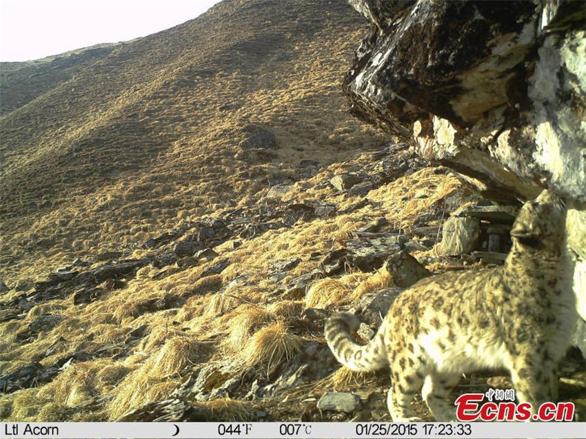 | Picture of a snow leopard was captured by an infrared camera, set up at an altitude of 4,102 meters, at the Wolong National Nature Reserve in Southwest China’s Sichuan province, Jan. 1, 2015. In a short video clip, the snow leopard was also found roaming with its cub, about one year old, on the mountain. Snow leopards, one of China's Class A protected animals, are usually found in the Himalayan ranges of central and south Asia at altitudes between 3,000 and 5,500 meters. (Photo provided to China News Service) |