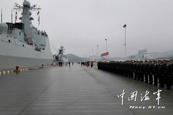 The photo taken on April 3 shows a send-off ceremony held at a military port in Zhoushan, east China's Zhejiang province. The 20th Chinese naval escort taskforce departs from a military port in Zhoushan and head for the Gulf of Aden and waters off Somali coast on the morning of April 3, 2015, to take over the escort mission from the 19th escort taskforce.(Photo: Chinamil.com.cn/Dai Zongfeng)