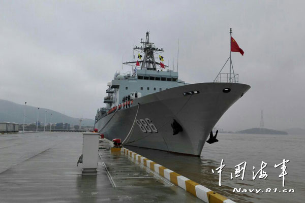 The Chinese naval supply ship Qiandaohu berths at a military port in Zhoushan, east China's Zhejiang province on April 3, 2015. The 20th Chinese naval escort taskforce departs from a military port in Zhoushan, east China's Zhejiang province, and head for the Gulf of Aden and waters off Somali coast on the morning of April 3, 2015, to take over the escort mission from the 19th escort taskforce.(Photo: Chinamil.com.cn/Dai Zongfeng)