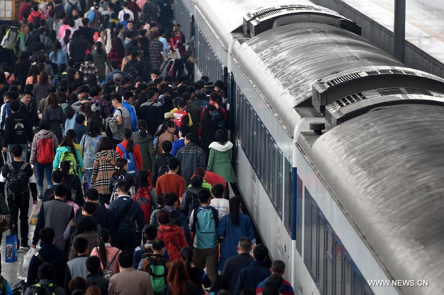 Passengers queue to get on trains at Zhengzhou Railway Station in Zhengzhou, capital city of central China's Henan Province, April 3, 2015. Zhengzhou received a travel rush during China's traditional Qingming Festival, or Tomb-sweeping Day, which falls on April 5 this year. (Xinhua/Li Bo)