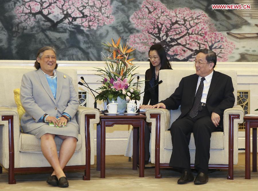 | Yu Zhengsheng (R), chairman of the National Committee of the Chinese People's Political Consultative Conference, meets with visiting Thai Princess Maha Chakri Sirindhorn in Beijing, capital of China, April 3, 2015. (Xinhua/Ding Lin) |