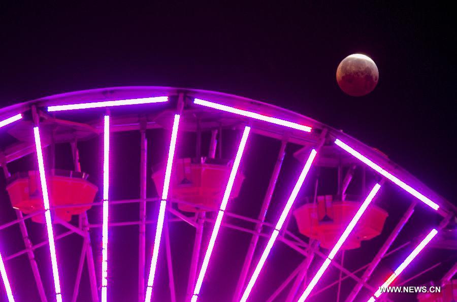 The moon, with an orange hue that gives it the famous name "blood moon", is seen behind a ferris wheel at Santa Monica Beach in Santa Monica, California, during a total lunar eclipse on April 4, 2015. According to astronomical data, the eclipse is the shortest one since the 21st century as the totality lasted only for 12 minutes. (Xinhua/Zhao Hanrong)