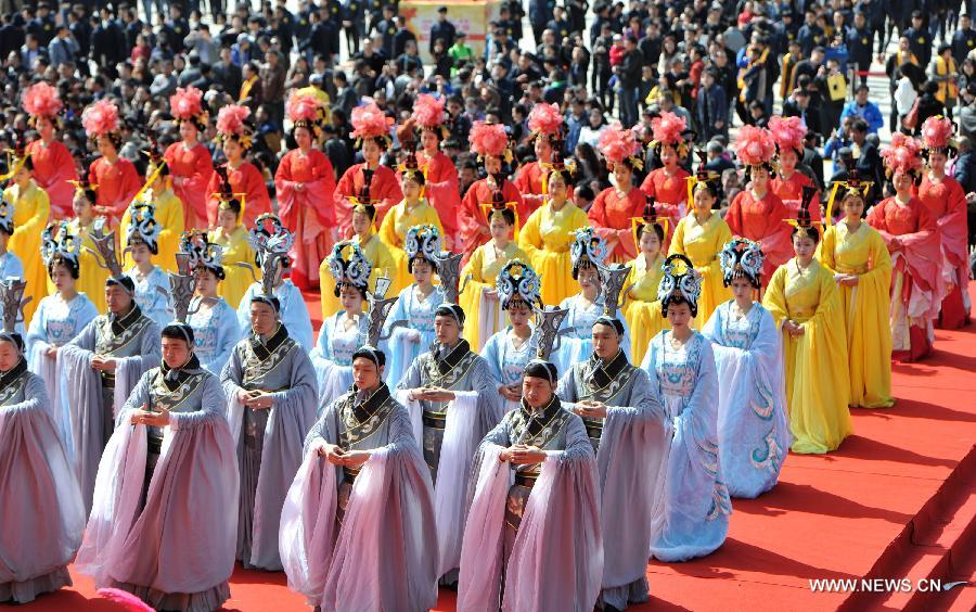 | A ceremony is held to honor Huangdi, or the Yellow Emperor, who is considered as the ancestor of the Chinese nation, on Qingming Festival in Huangling County, northwest China's Shaanxi Province, April 5, 2015. (Xinhua/Ding Haitao) |
