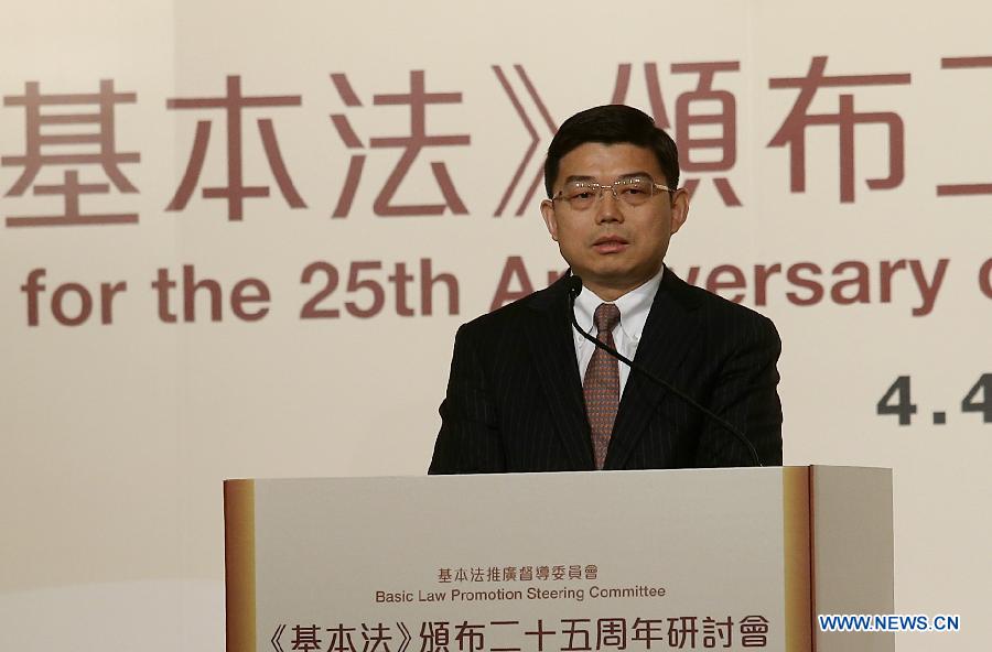 Wang Zhenmin, dean of Tsinghua University law school, speaks at a seminar for the 25th anniversary of the promulgation of the Basic Law in south China's Hong Kong, April 4, 2015. The Basic Law, adopted on April 4, 1990, embodies the vision of "one country, two systems," a pragmatic solution allowing China to incorporate the political and economic complexities of Hong Kong. (Xinhua/Lui Siu Wai)