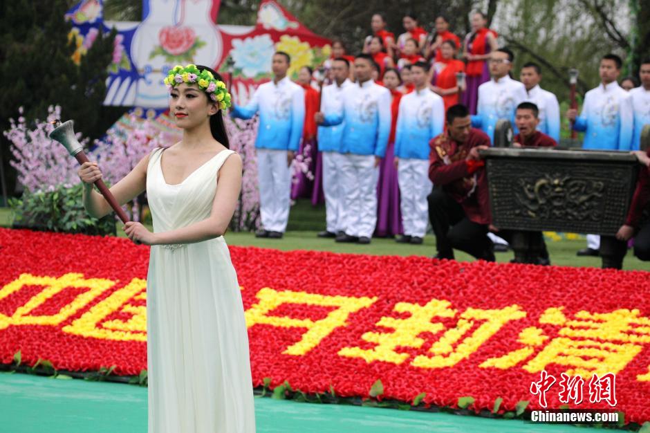 Girls in white dresses pass down the torch, a symbol of passing down the traditions of Qing Ming, at the Qing Ming cultural festival in Kaifeng, central China’s Henan, April 1, 2015. (Chinanews/Wang Zhongju)