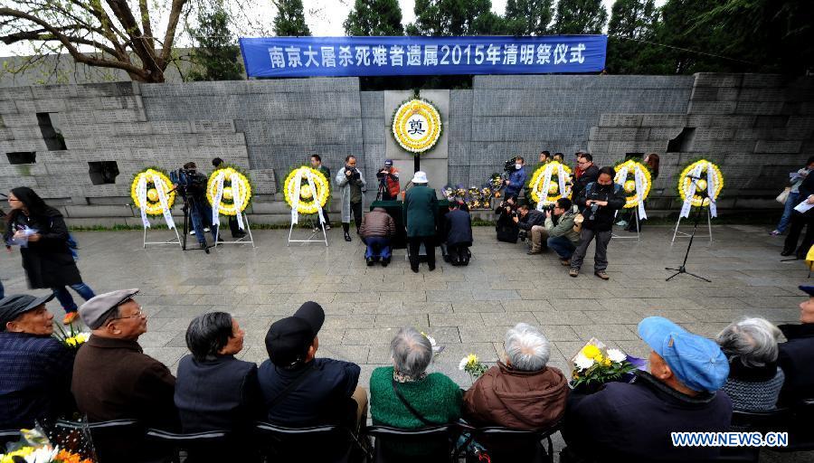 Survivors and relatives of victims of Nanjing Massacre take part in a ceremony to mourn the Nanjing Massacre victims in front of a wall inscribed the name list of victims at the Memorial Hall of the Victims in Nanjing Massacre by Japanese Invaders on Spring Festival in Nanjing, capital of east China's Jiangsu Province, April 5, 2015. Japanese troops captured Nanjing, then China's capital, on Dec. 13 of 1937 and started a 40-odd-day slaughter. More than 300,000 Chinese soldiers who had laid down their arms and civilians were murdered, and over 20,000 women were raped. (Xinhua/Han Yuqing)