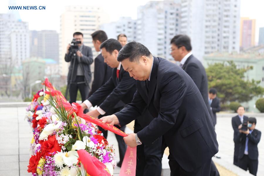 Li Jinjun (front), Chinese Ambassador to the Democratic People's Republic of Korea (DPRK), lays wreath in front of the China-DPRK Friendship Tower, in Pyongyang, DPRK, April 5, 2015. The ambassador visited a cemetery of Chinese martyrs that sacrified their lives in the Korean War in Hoechang County of South Pyongan Province Sunday. (Xinhua/Lu Rui)