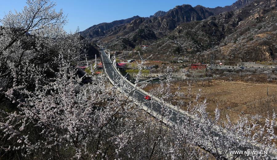 Flowers are in full blossom near the No. 111 national road in the Huairou District of Beijing, capital of China, April 7, 2015. (Xinhua/Bu Xiangdong)