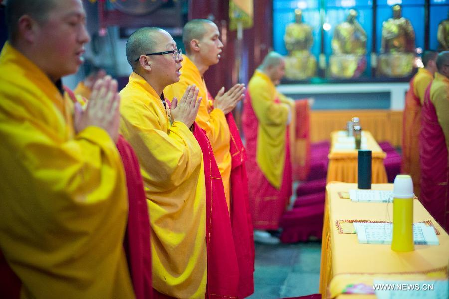 Monks take part in a Buddhist ritual to celebrate the birthday of Bodhisattva Guanyin at Qiyuan Temple on Jiuhua Mountain, east China's Anhui Province, April 7, 2015. Jiuhua Mountain, one of the four sacred mountains of Chinese Buddhism, ususally hold various Buddhist rituals and events on the birthday of Bodhisattva Guanyin, which falls on the 19th day of the second month in the lunar calender. (Xinhua/Guo Chen)