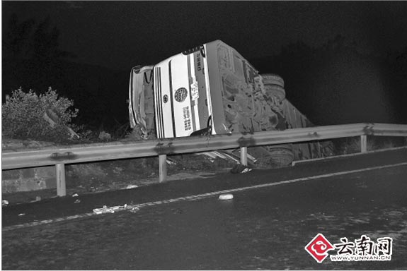 The coach was heading to the provincial capital Kunming when it hit the guardrail and overturned at a segment of an expressway in Nanhua County.