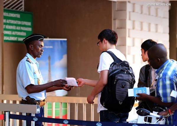 | An airport staff member checks the passport of a Chinese evacuee in Djibouti, March 31, 2015. (Photo/Xinhua) |