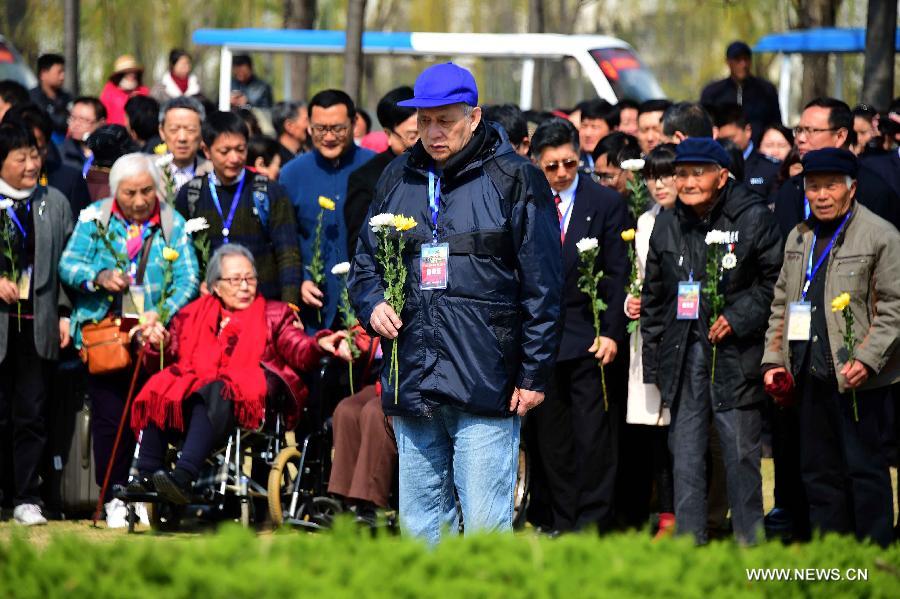 | Zhang Jizu, grandson of late general Zhang Zizhong, mourn in front of a tomb of the unknown soldiers at the Relics Park of the Tai'erzhuang Battle during a ceremony to celebrate the 77th anniversary of the victory of the battle in Tai'erzhuang, east China's Shandong Province, April 8, 2015. The Tai'erzhuang Battle, a battle of the Anti-Japanese War (1937-1845) in 1938 between Chinese and Japanese armies, was the first major Chinese victory of the war. It humiliated the Japanese military and its reputation as an invincible force. Meanwhile, it greatly boosted morale of Chinese people. (Xinhua/Guo Xulei) |