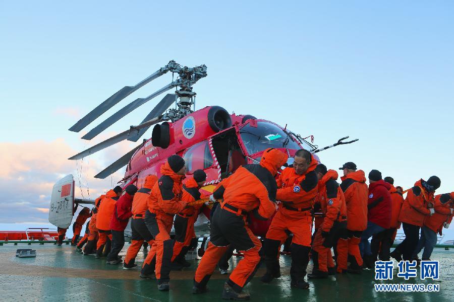 Photo taken on Dec. 6, 2014 shows expedition members moving a helicopter into the hangar on Xuelong. (Photo/Xinhua)
