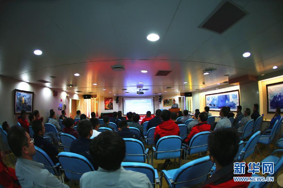 Photo taken on Nov. 8, 2014 shows expedition members attending an "Antarctic University" lesson on Xuelong. "Antarctic University" is a traditional learning program on Xuelong. Crew members of different backgrounds teach a variety of subjects throughout the voyage. Each member will be given an honorary certificate after "graduation" by the end of the expedition. (Photo/Xinhua)