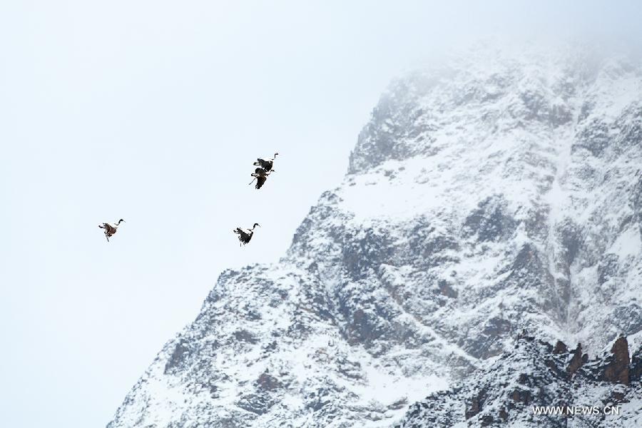 This is a photo of black-necked cranes taken by photographer Dong Lei. China's first nature image record named "The Beauty of Nature - Nature & Wildlife Photography in China" was released recently, which includes the essence of the 63 programs IBE (Imaging Biodiversity Expedition) has researched on in the six years since it was founded. IBE, founded in 2008, is an institute which aims to record the nature in China by using imaging biodiversity expedition. (Xinhua/Dong Lei)