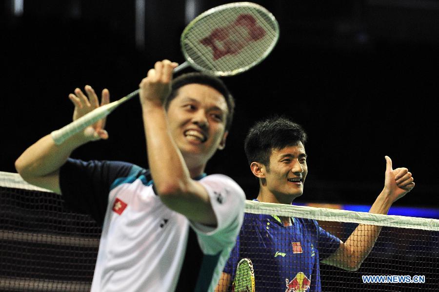 Hu Yun (L) of China's Hong Kong and Chen Long of China gesture after the men's singles second round match of the OUE Singapore Open in Singapore, April 9, 2015. Hu Yun won 2-1. (Xinhua/Then Chih Wey)