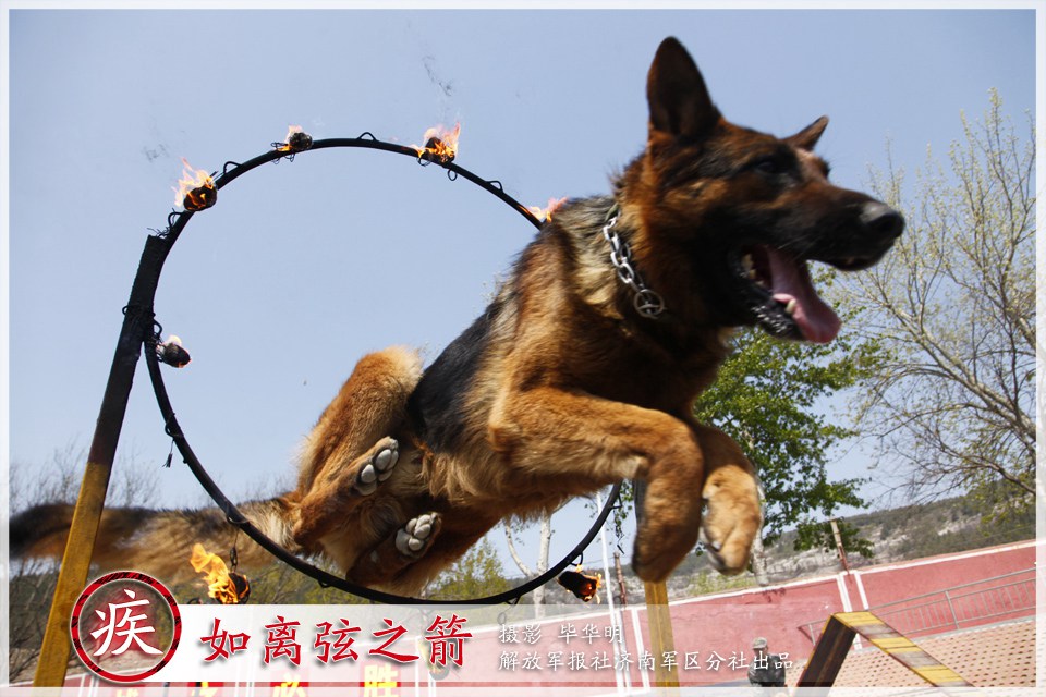 Soldiers from Jinan Military Region train their dogs to surmount obstacles, go through fire circles, cross bridges and catch things rapidly. Those dogs are trained to sit, lie down, stand, walk and bite. (Chinamil.com.cn/Bi Huaming)