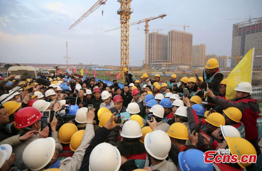 Premier Li Keqiang (C) is surrounded by workers at the construction site of a transportation hub in Changchun, the capital of Northeast China’s Jilin province, April 9, 2015. Li emphasized the important role of investment in driving up the economy. (Photo: China News Service/Liu Zhen)