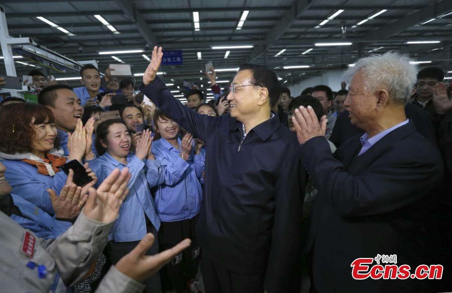 | Premier Li Keqiang (C) talks with workers during his visit to a State-owned bulb factory in Changchun, the capital of Northeast China’s Jilin province, April 9, 2015. Most of more than 7,500 workers in the factory, now transformed into the country's largest wire harness manufacturing company, come from nearby communities. (Photo: China News Service/Liu Zhen) |