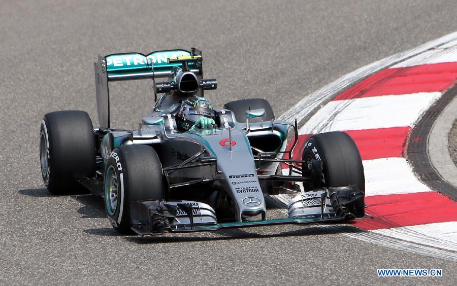 Mercedes AMG Petronas F1 Team's German driver Nico Rosberg drives his car during the first practice session of the Formula One Chinese Grand Prix in Shanghai, east China, April 10, 2015. (Xinhua/Fan Jun)