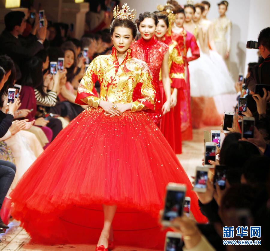 Models present the creations of designer Guo Pei at haute couture fashion week in Shanghai, east China, April 10, 2015. (Photo source: news.cn/ent)