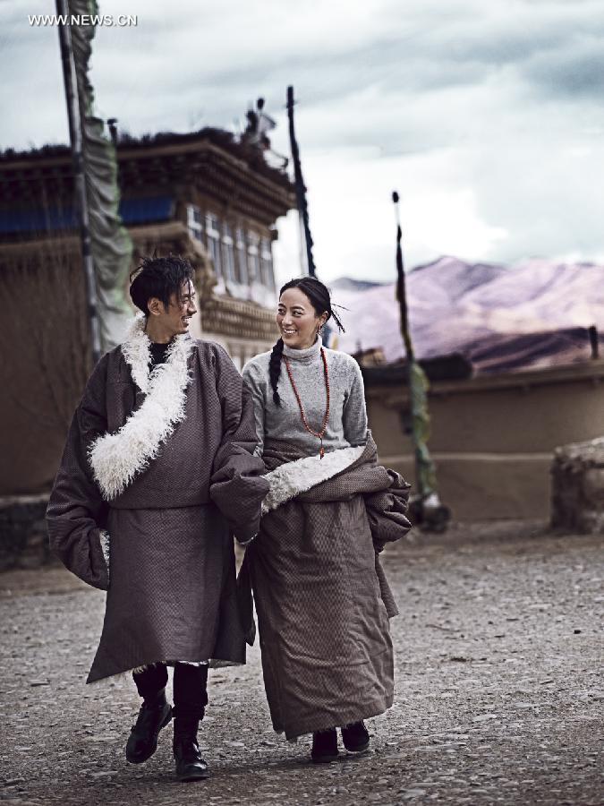 This is a wedding photo of the bridegroom Gerong Phuntsok (L) and his wife Dawa Zhoima taken in Aba Prefecture, southwest China's Sichuan Province. Wearing traditional Tibetan costumes and also modern clothes in their wedding photos, the Tibetan couple has become a hot topic on Tencent's instant messaging app Wechat, with their photos receiving clicks of more than 100,000 times in four hours. (Xinhua/He Di)